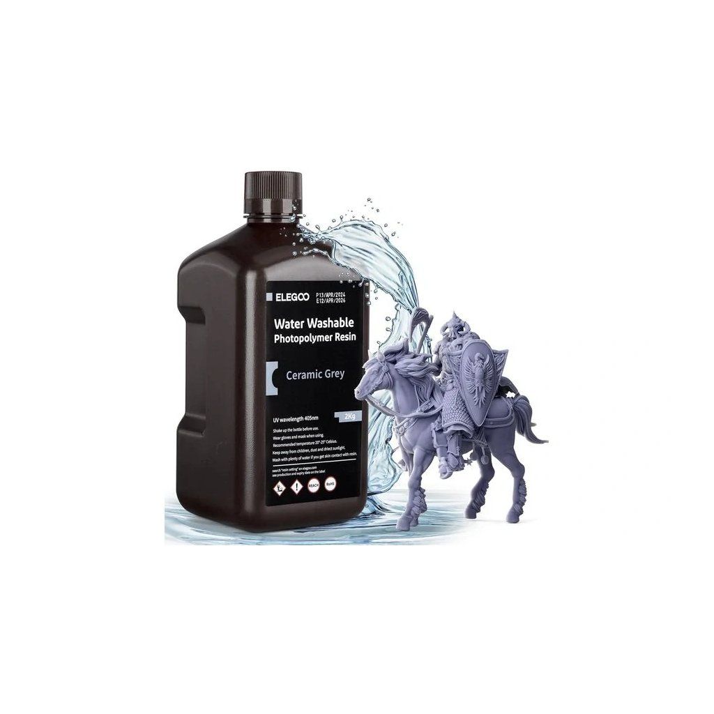 Keramická sivá živica Elegoo, ktorú možno umývať vodou, zaručuje, že modely vytlačené týmto materiálom možno čistiť vodou z vodovodu bez poškodenia. Túto vlastnosť oceníte napríklad v prašnom alebo špinavom prostredí, kde je potrebné pravidelne udržiavať čistotu. Na čistenie nie sú potrebné žiadne drahé čistiace prostriedky ani škodlivé chemikálie, stačí obyčajná voda. Táto živica je vysokokvalitný materiál špeciálne navrhnutý pre svetelné zdroje LCD/LED, ktorý možno použiť s väčšinou značiek 3D tlačiarní LCD a DLP a pokrýva širokú škálu tlačových aplikácií. Medzi jej výhody patrí nízke objemové zmrštenie, vysoká presnosť tlače, rýchle vytvrdnutie modelu, vysoká stabilita a nízky zápach. Medzi ďalšie výhody patrí vynikajúca tvrdosť a flexibilita. Vlnová dĺžka materiálu na vytvrdzovanie na tlačiarni LCD SLA je 365 – 405 nm. Výrobok sa dodáva vo fľaši obsahujúcej 2 kg živice.