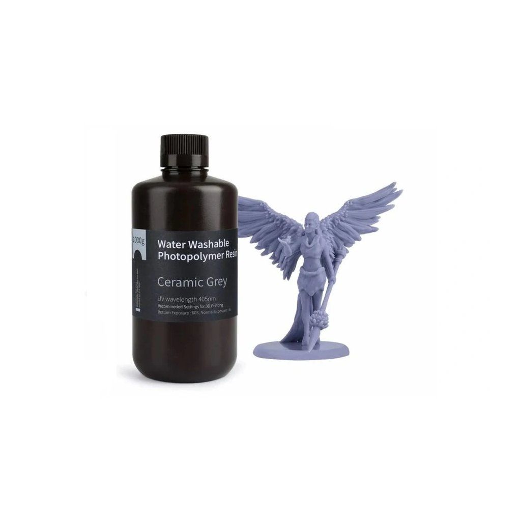 Keramická sivá živica Elegoo, ktorú možno umývať vodou, zaručuje, že modely vytlačené týmto materiálom možno čistiť vodou z vodovodu bez poškodenia. Túto vlastnosť oceníte napríklad v prašnom alebo špinavom prostredí, kde je potrebné pravidelne udržiavať čistotu. Na čistenie nie sú potrebné žiadne drahé čistiace prostriedky ani škodlivé chemikálie, stačí obyčajná voda. Táto živica je vysokokvalitný materiál špeciálne navrhnutý pre svetelné zdroje LCD/LED, ktorý možno použiť s väčšinou značiek 3D tlačiarní LCD a DLP a pokrýva širokú škálu tlačových aplikácií. Medzi jej výhody patrí nízke objemové zmrštenie, vysoká presnosť tlače, rýchle vytvrdnutie modelu, vysoká stabilita a nízky zápach. Medzi ďalšie výhody patrí vynikajúca tvrdosť a flexibilita. Vlnová dĺžka materiálu na vytvrdzovanie na tlačiarni LCD SLA je 365 – 405 nm. Výrobok sa dodáva vo fľaši obsahujúcej 1 kg živice.