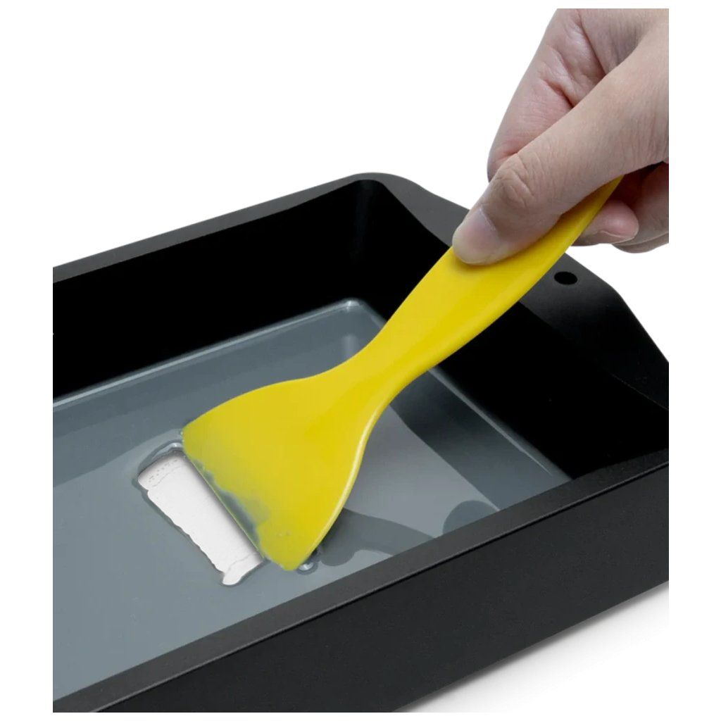 - Pomocou plastovej škrabky skontrolujte či sa v nádržke na resin nenachádza vytvrdnutý reisn.